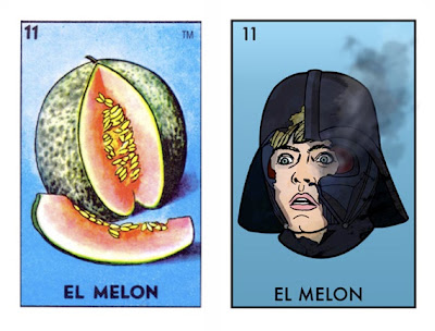 Artist (and musician) Chepo Peña of Austin, TX has combined two of my favorite things in a way that is nothing short of genius. Loteria (the traditional Mexican Bingo game with the illustrated cards) and the classic George Lucas Star Wars movie. And voila! You've got Space Loteria. Besides being humorous, they are truly clever, with some great visual puns (e.g. Yoda as shrimp, Darth as melonhead).